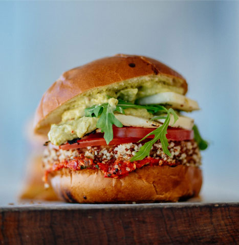 Spicy black bean roasted patty served with lettuce, tomato, and pickles